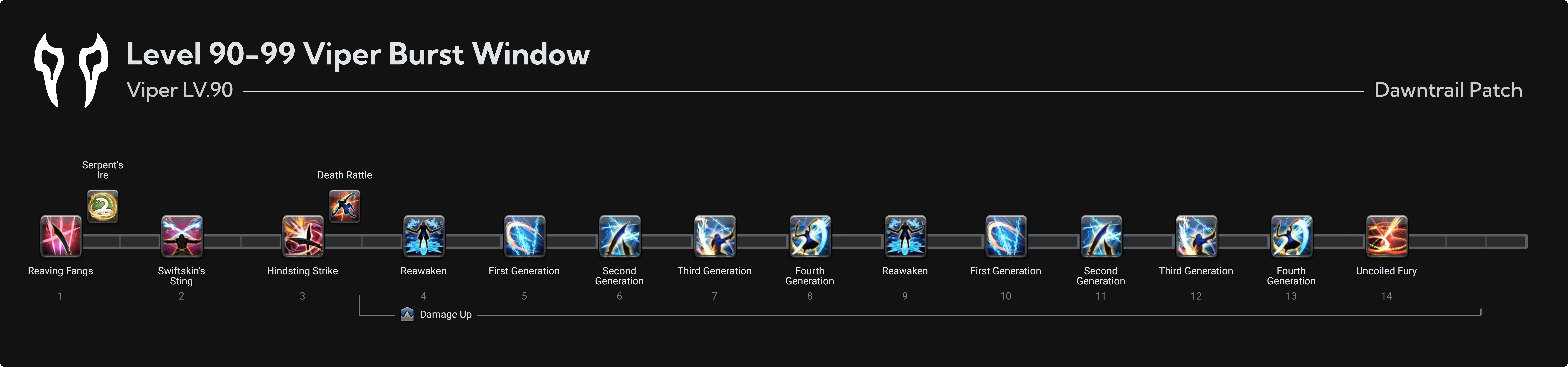 After obtaining Reawaken at level 90 the even minute burst window replaces Vicewinders for Reawaken. After the opener, use Serpent’s Ire off cooldown then use two filler GCDs before using two Reawaken combos back to back, ending with an Uncoiled Fury before party buffs expire.